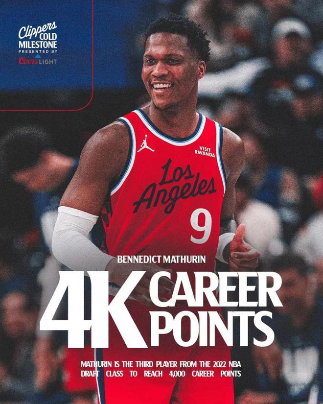 快船新援马瑟林迎来生涯常规赛4000分里程碑,成为2022届选秀第3人,前两位是班凯罗与杰伦-威廉姆斯。